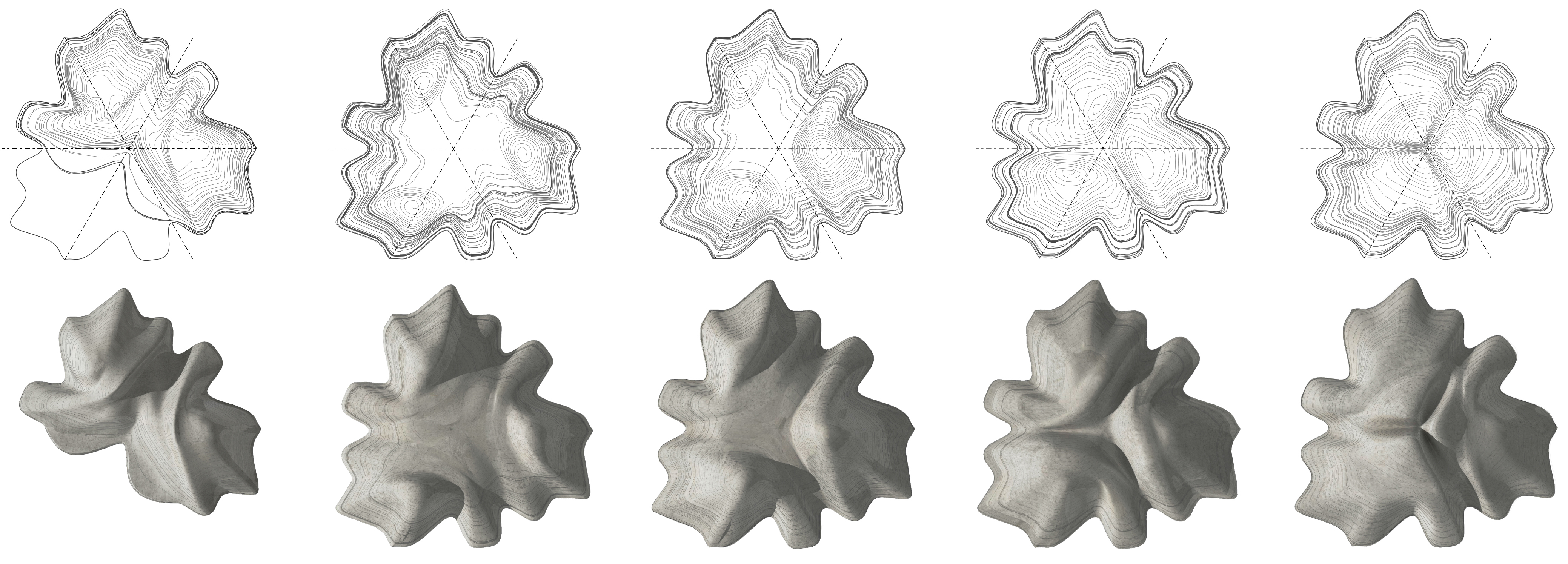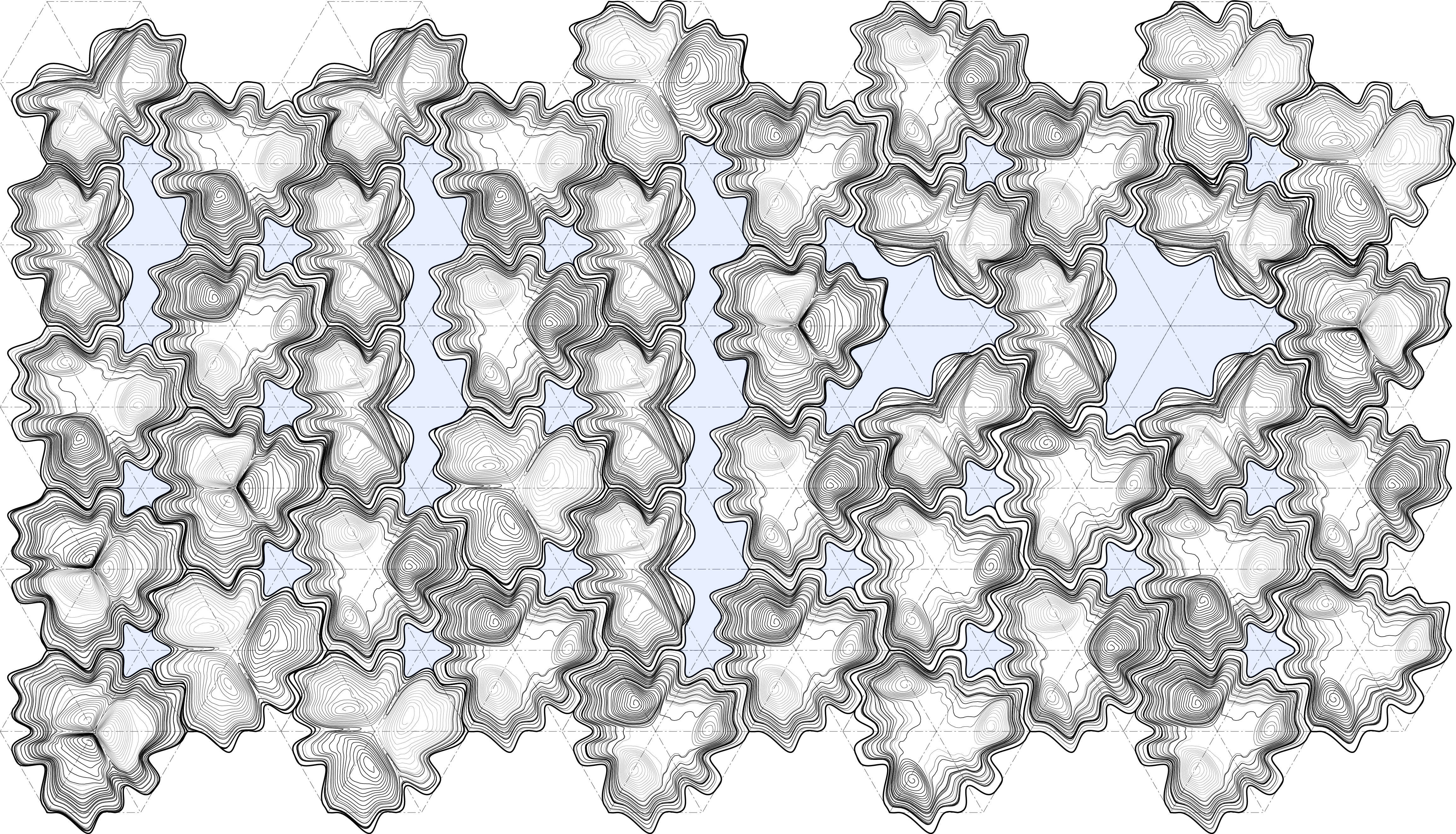 Inspired by Escher’s geometric studies, first part of the project looks at the transformation limits of a single primitive. We investigated figure-ground relationships through nesting, adjacency, and interlocking by studying the parametric qualities of a hexagon. While the geometric patterns have a fluid internal logic, they assemble a coherent pattern due to static anchor points between adjacent boundaries. By stabilizing the boundaries through the sheet-forming process, we are able to then internally animate each form independently from one another. This allows us to exploit the full potential of a gradient changing pattern, while evoking the viewers curiosity.